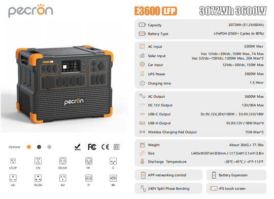 No reviewsPecron E3600LFP Portable Power Station (3600W | 3072Wh) The Pecron E3600LFP is a high-capacity LiFePO4 solar generator engineered for home backup, RV living, off-grid cabins, overlanding, and professional work sites.With 3600W output and a massive 3072Wh...Sale price From $1,099.00Regular price $2,299.00Sale price From $1,099.00Regular price $2,299.00 -